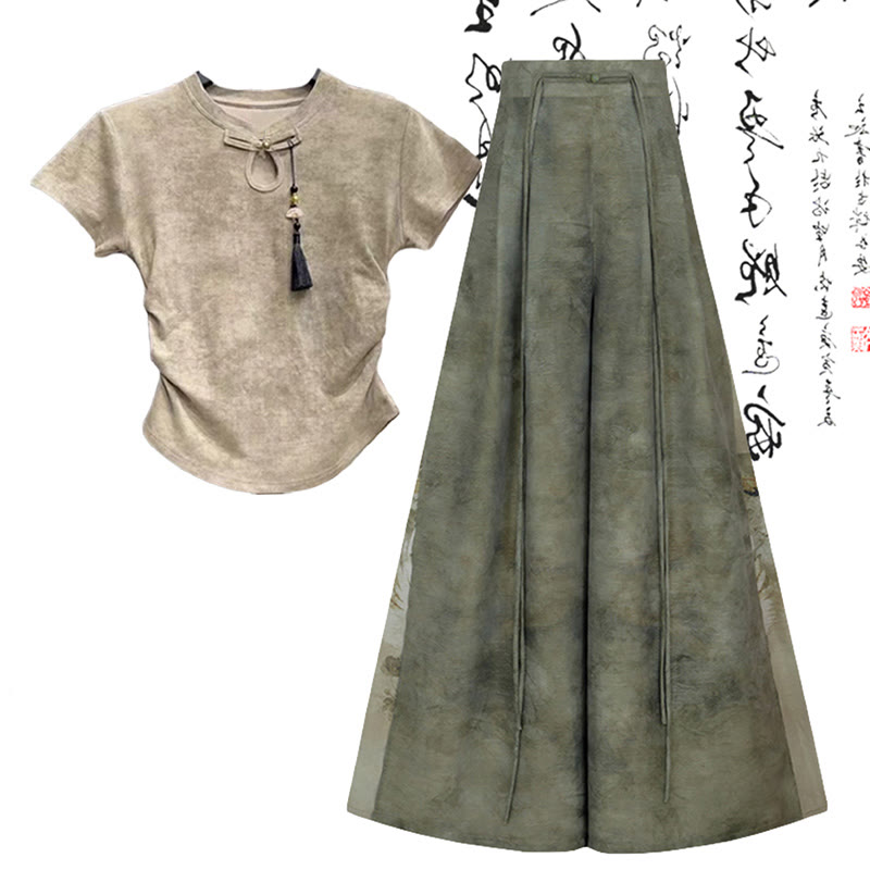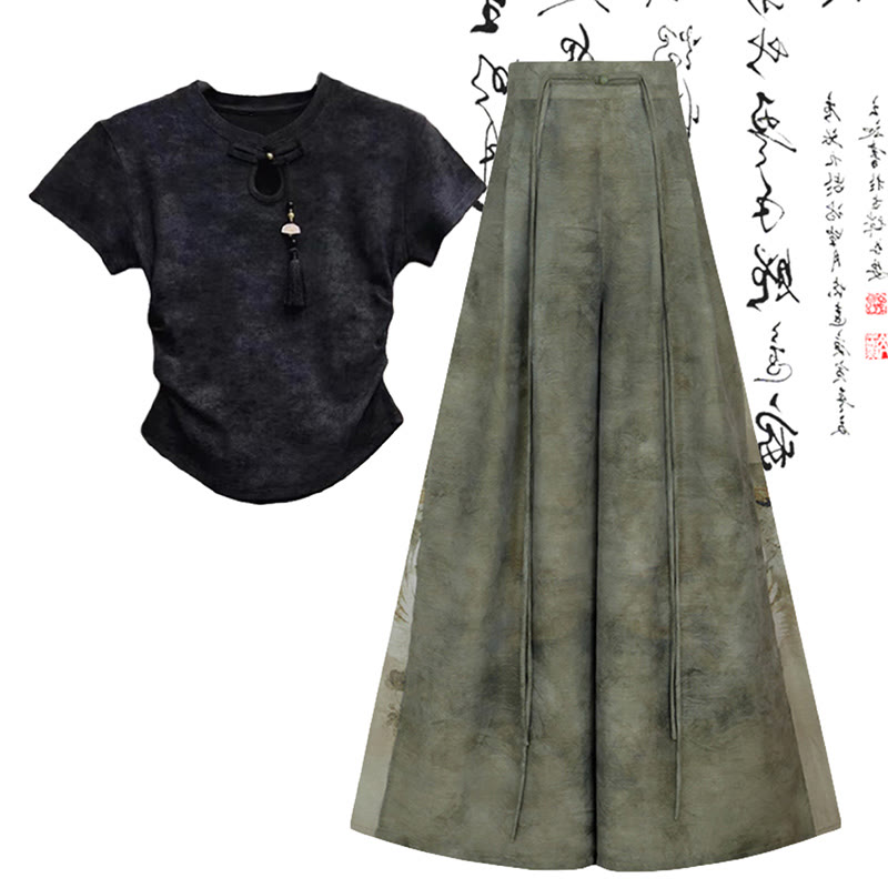 レタープリントTシャツ、チェックシャツ、ワイドレッグパンツスカートの3点セット