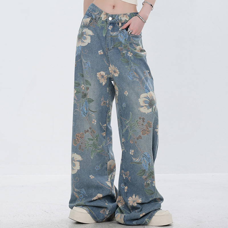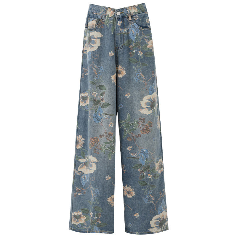 フラワープリントカジュアルデニムパンツ
