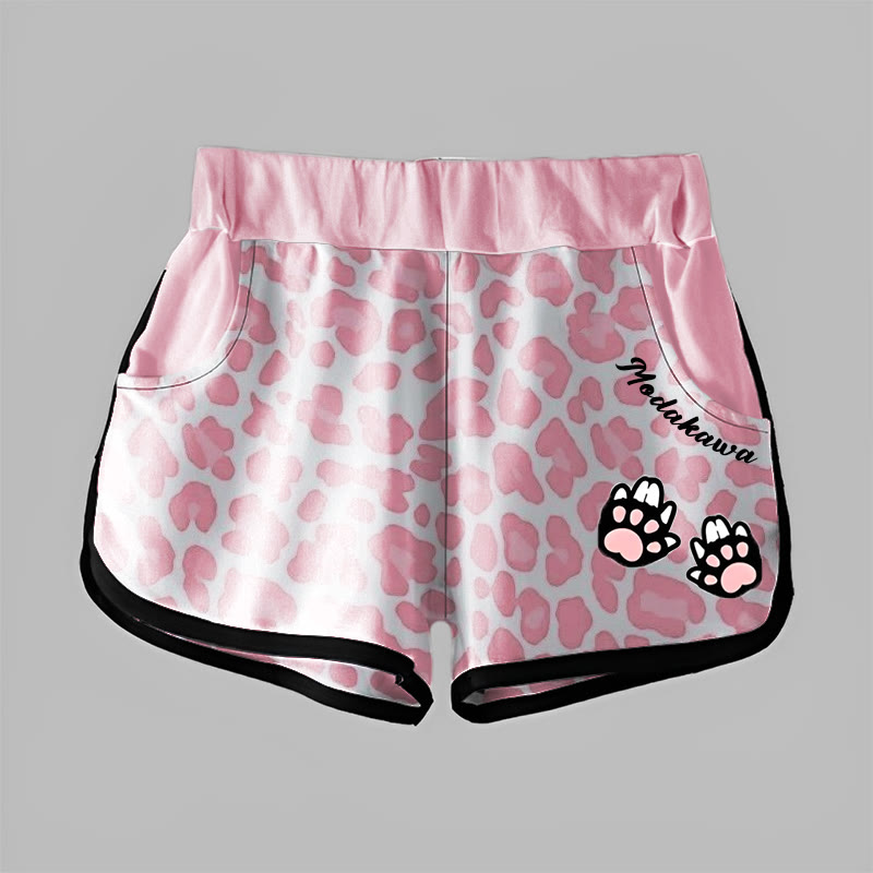 ヒョウ柄の足跡と文字のプリントが特徴のModakawaショーツ