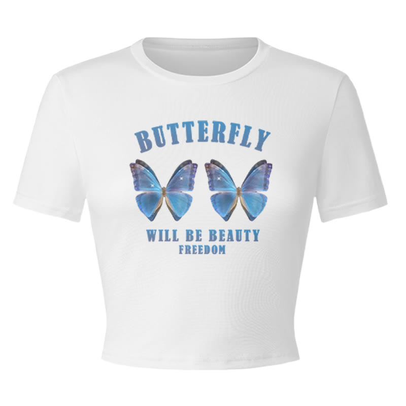 BUTTERFLY WILL BE BEAUTY FREEDOMプリントModakawaクロップトップ