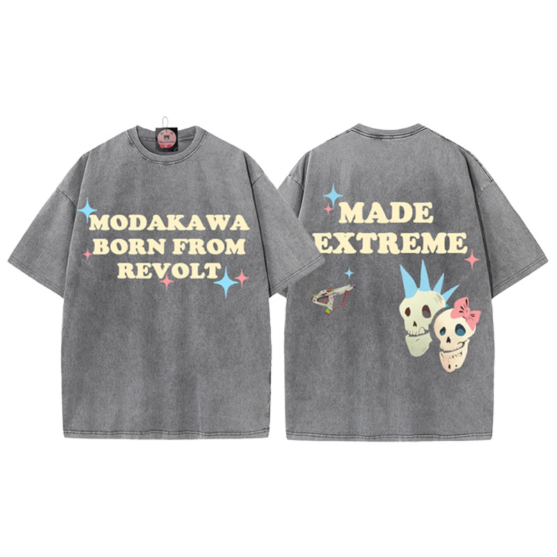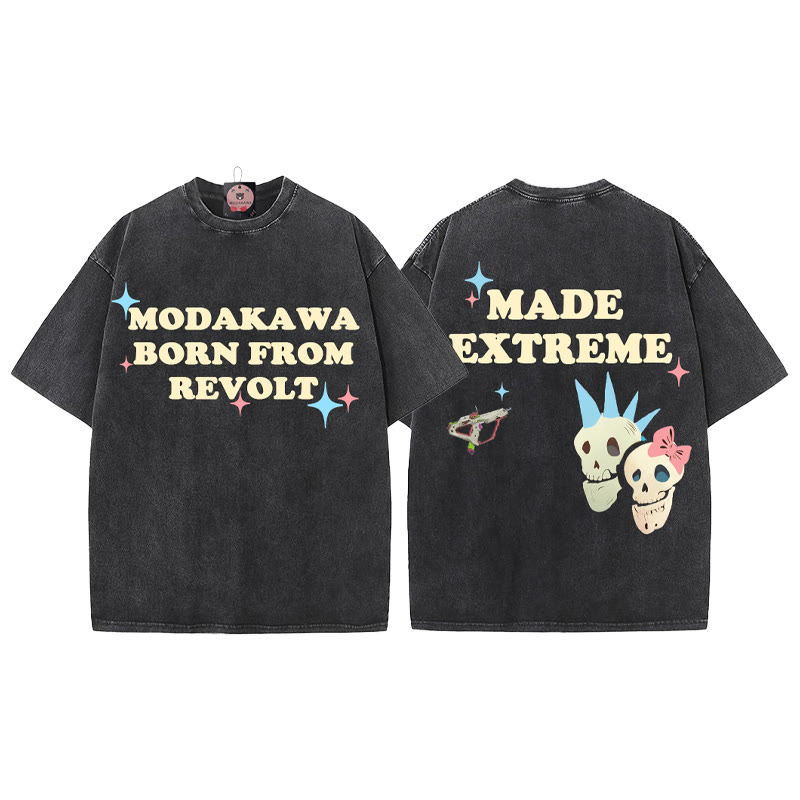 BORN FROM REVOLT スカルプリント ヴィンテージウォッシュド100%綿ModakawaTシャツ
