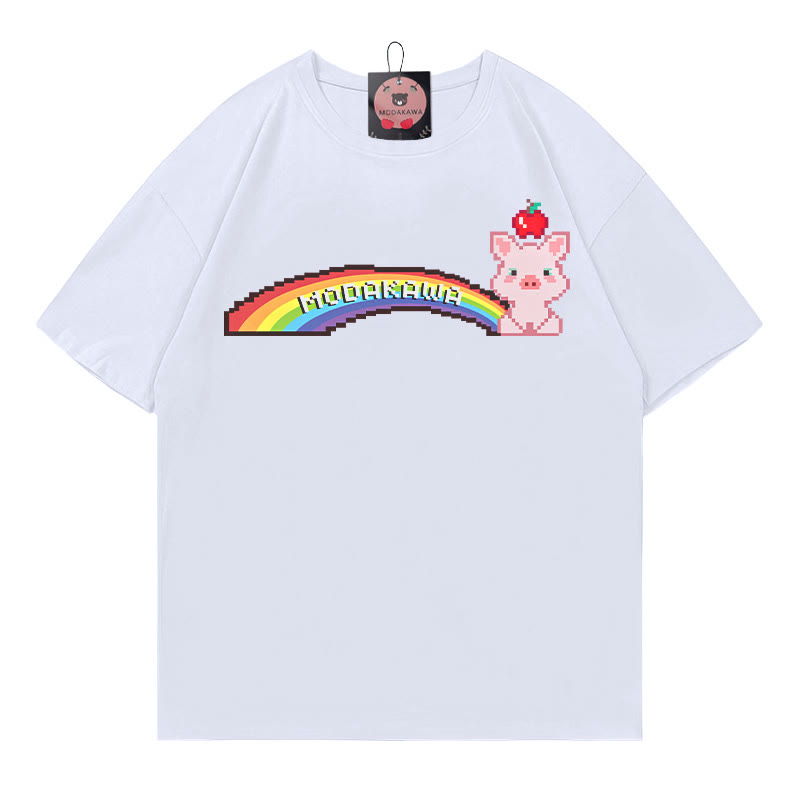 レインボーピッグレタープリント100%綿ModakawaTシャツ