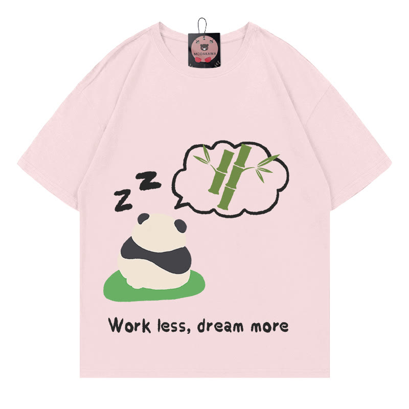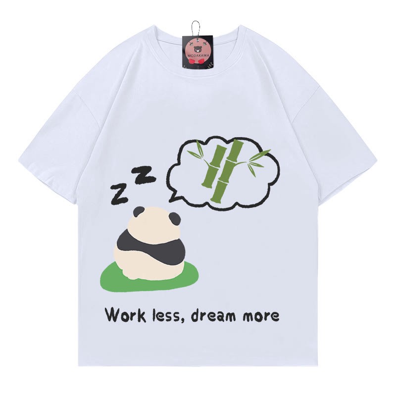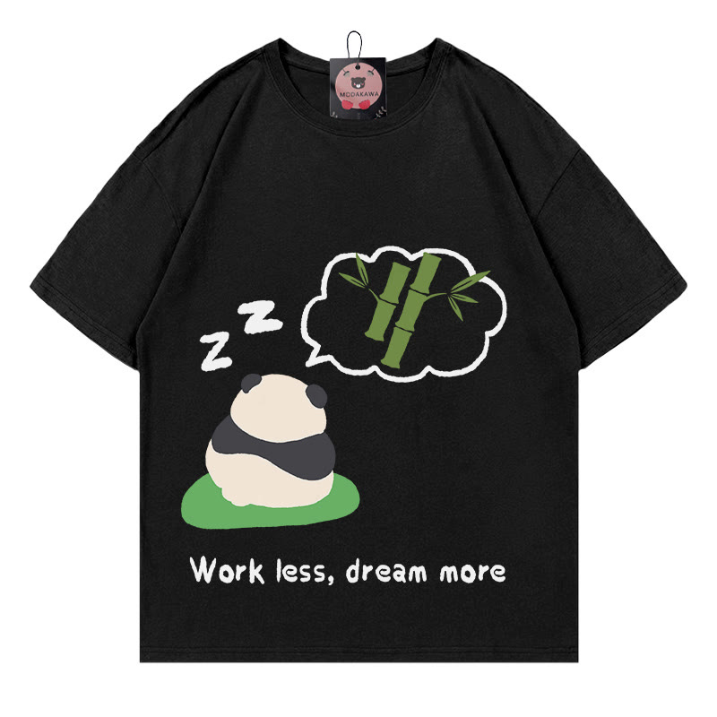 仕事を減らして夢をもっと描く、パンダプリントの100%綿ModakawaTシャツ