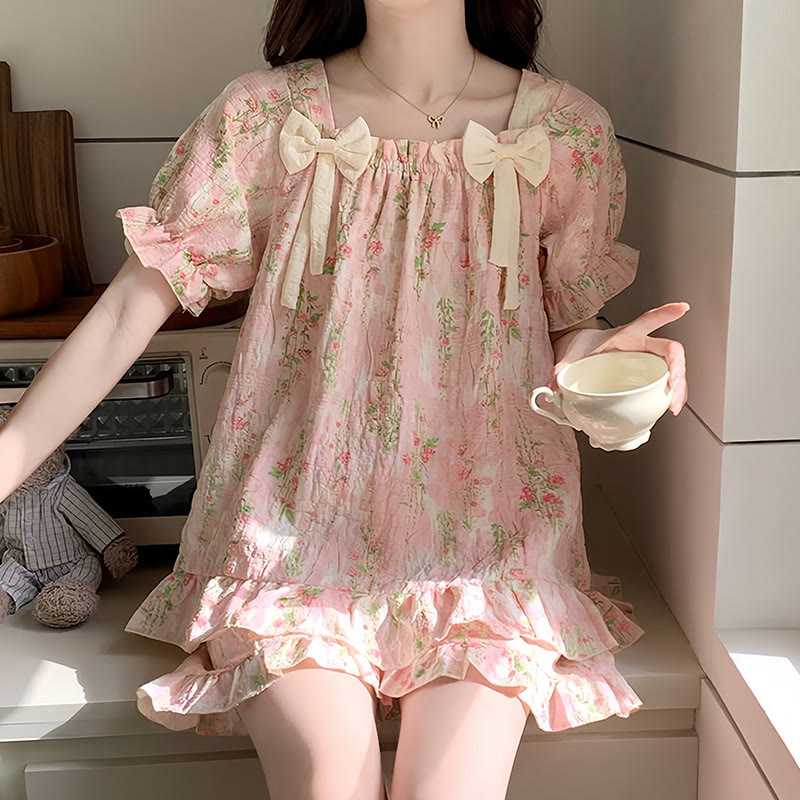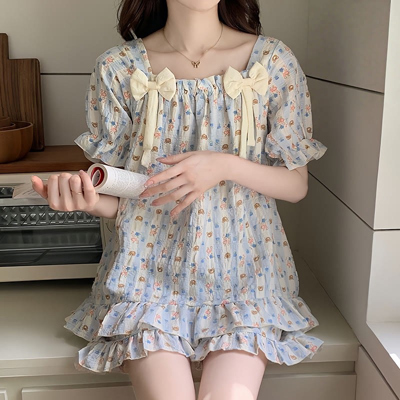 リボンフラウンスパジャマ2点セット(胸パッド付き)