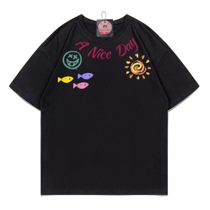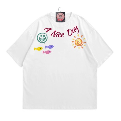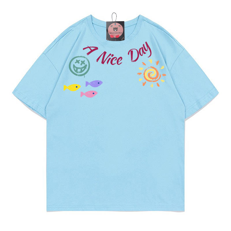 A NICE DAY笑顔 魚 太陽 プリント100%綿ModakawaTシャツ
