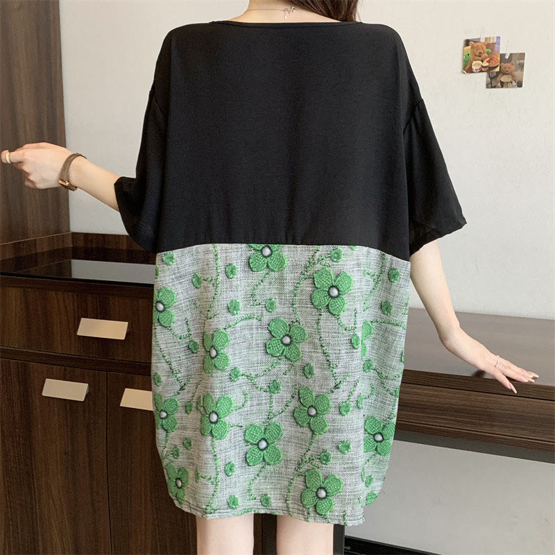 フェイクツーピースフラワープリントカラーブロックTシャツ